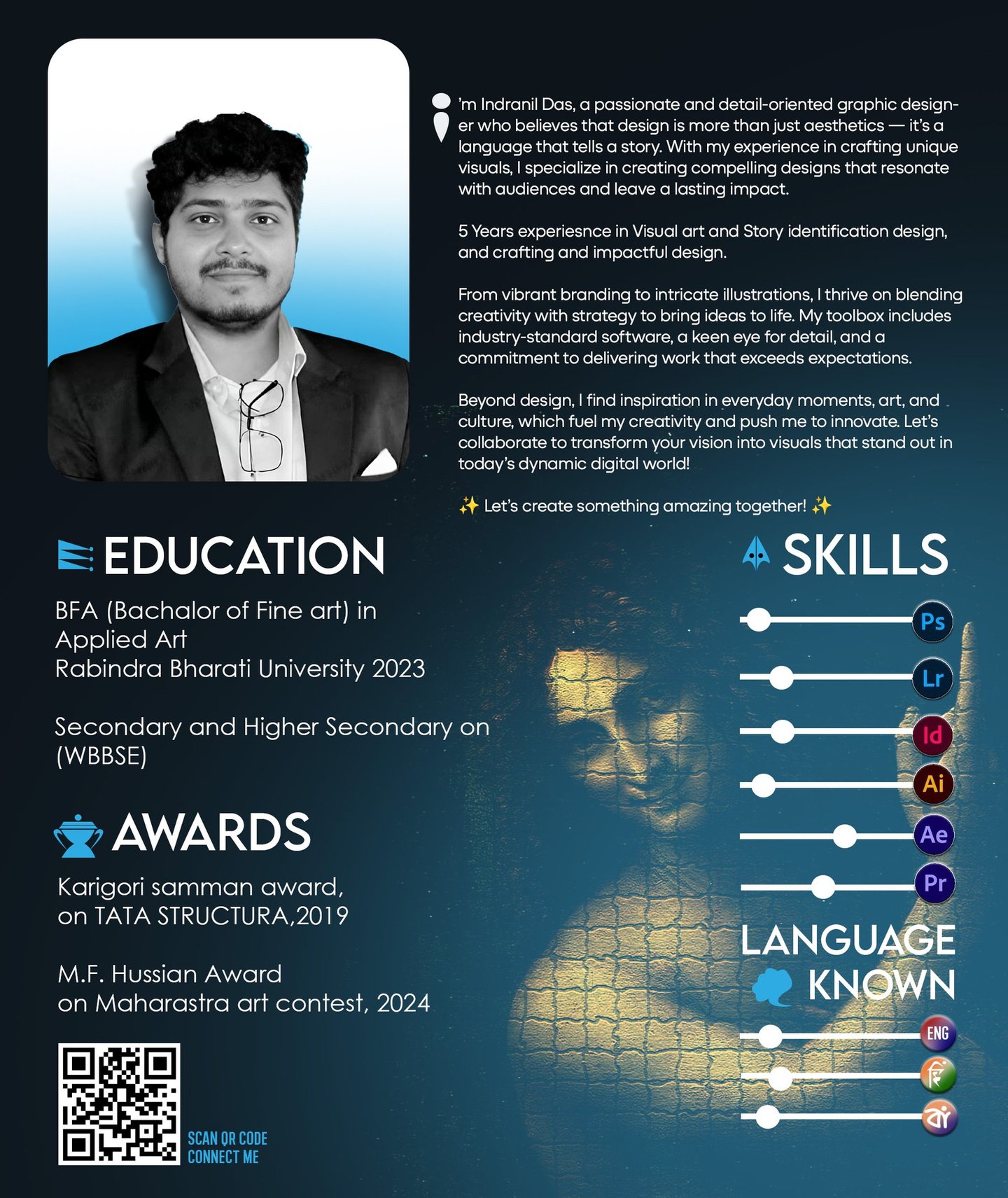 I’m Indranil Das, a passionate graphic designer from the vibrant land of India, where tradition meets innovation. For me, design isn't just about making things look good — it's about creating visual stories that connect, inspire, and leave a lasting impact..